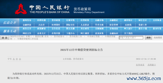 中国东说念主民银行12月24日秘书,将于12月25日开展4000亿元MLF操作。