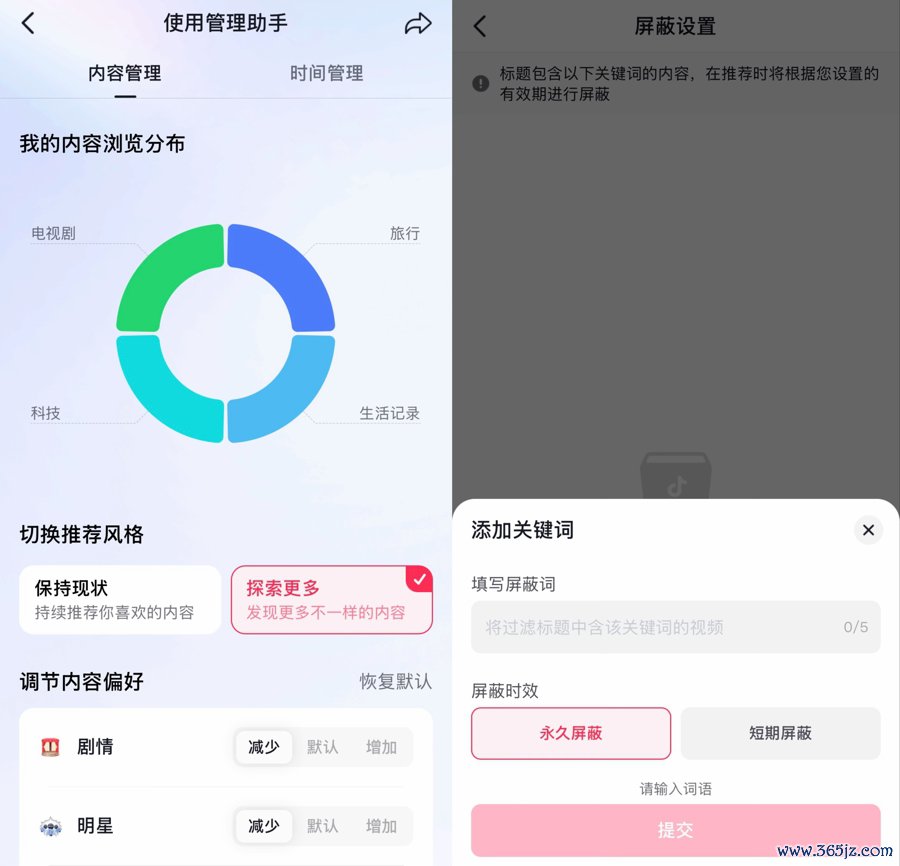抖音“使用束缚助手”:用户可自主缔造保举作风、内容偏好、屏蔽关节词